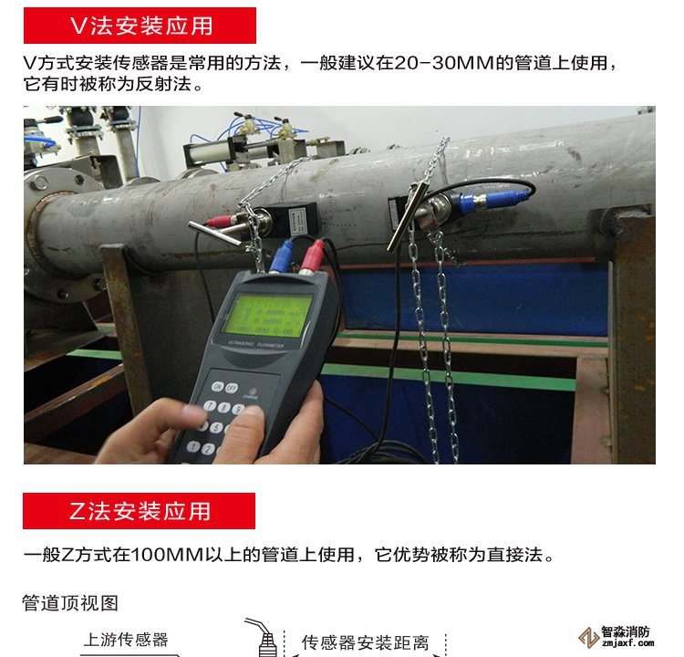 超聲波流量計的傳感器一般采用V方式和Z方式安裝,通常情況下,管徑小于300mm時,采用V方式安裝,管徑大于200mm時,采用Z方式安裝。對于即可以用V方式安裝又可以Z方式安裝的傳感器,盡量選用Z方式。實踐表明,Z方式安裝的傳感器超聲波信號強度高,測量的穩定性也好,圖2。