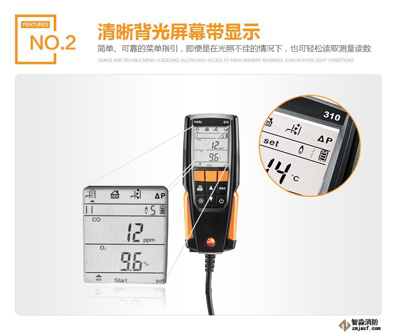 testo 310煙氣分析儀操作簡便,內置4個引導式測量菜單:煙氣測量,抽力測量,環境CO測量以及差壓測量。帶背光大顯示屏,適用于各種照明條件情況。