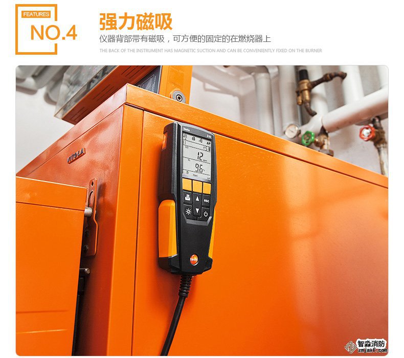 不僅如此,該手持式煙氣分析儀還具有多項其它實用特性。儀器背部帶有磁吸,可吸附于所有金屬表面,比如燃燒器外殼,方便您騰出雙手處理其他事務。傳感器自動調零,僅需30秒,過濾芯更換極其簡便。與此同時,testo 310輕便、堅固且耐用,防塵防撞擊,內置冷凝槽可快速簡便的清空。