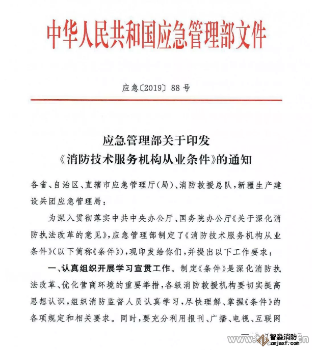 為深入貫徹落實中共中央辦公廳、國務院辦公廳《關于深化消防執(zhí)法改革的意見》,應急管理部制定了《消防技術服務機構從業(yè)條件》(以下簡稱《條件》),現印發(fā)給你們,并提出以下工作要求: